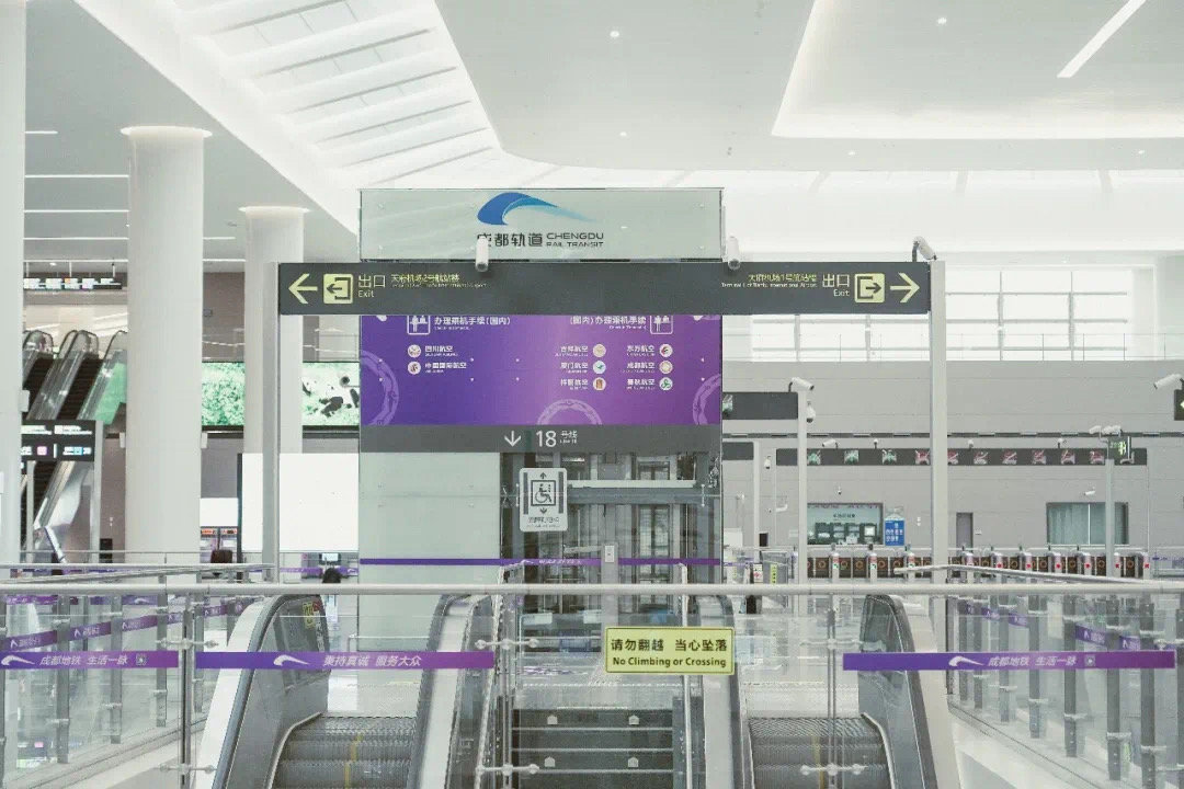 为强化地铁站与航站楼换乘指引,实现信息共享,车站内设置了天府机场航站楼布局导览图、路面引导牌及地铁线网图等导向标识;机场显示屏上增加地铁线网图、拥挤度、地铁首末班车时间、成都美景地图、成都地铁APP二维码等信息,方便乘客进行信息双向获取。同时,匹配18号线机场线路特色属性,建立线路“信息矩阵”,在18号线火车南站、孵化园站等换乘站点内综合信息显示屏同步接入天府国际机场航班等实时信息。