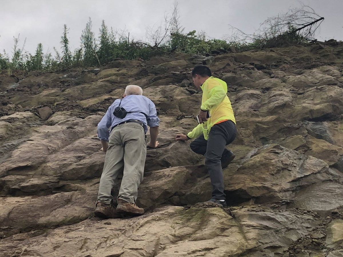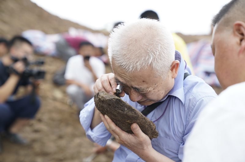 当天上午11时左右, 中国地质调查局成都地质调查中心研究员、硕士生导师江新胜从成都赶到现场。江新胜拿着放大镜对多处疑似恐龙化石进行了勘察,他表示现场的石头疑似是恐龙腿骨化石,还没有发现疑似脊椎骨和头骨的化石。建议当地相关部门把这一区域保护起来,以便下一步深入勘察研究。