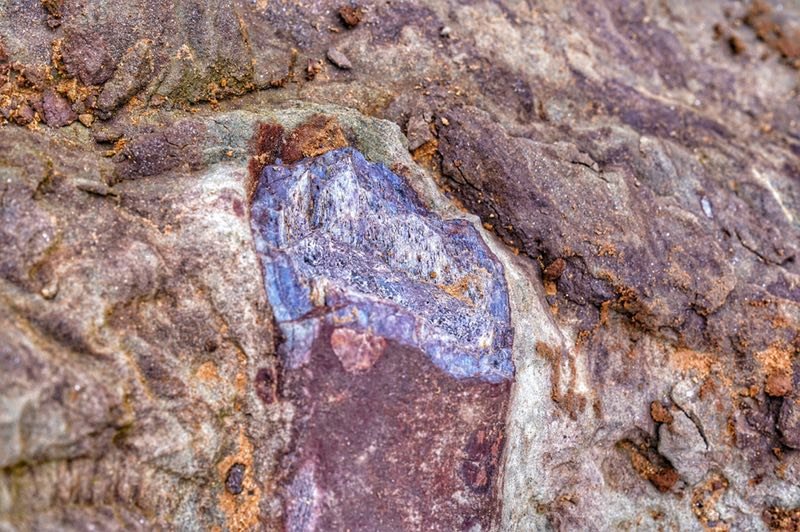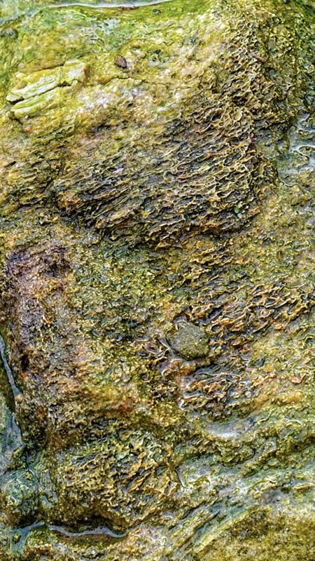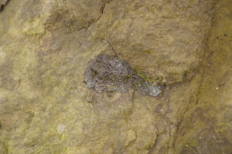 早上,蒙蒙细雨洒在港前大道施工现场护坡坎上,护坎坡高约6米,一眼望去光秃秃的浅丘层层叠叠,山坡上有很多裸露的岩石。在护坡坎下方,一块被雨水浸透、约成人手掌大小的浅灰色、表层鱼鳞状、有细孔的石头显得有些不同。在边坡上方,还有一些大小不一的同类石头。周围村民说,这些疑似是恐龙化石,斜坡处有些疑似恐龙化石还被防水布盖上以便保护。