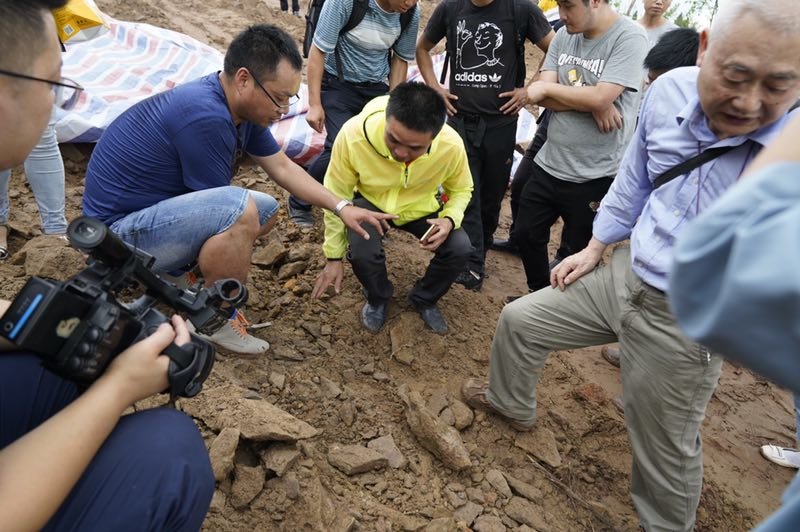 7月12日,广安市前锋区大佛寺街道办永兴村港前大道施工现场,蓝白相间的警戒线将一个足球场大的区域围了起来,警戒线内停留着一辆大型挖掘机,挖掘机附近站着近50名村民。村民们围在一起议论最近在此地发现的疑似恐龙化石。