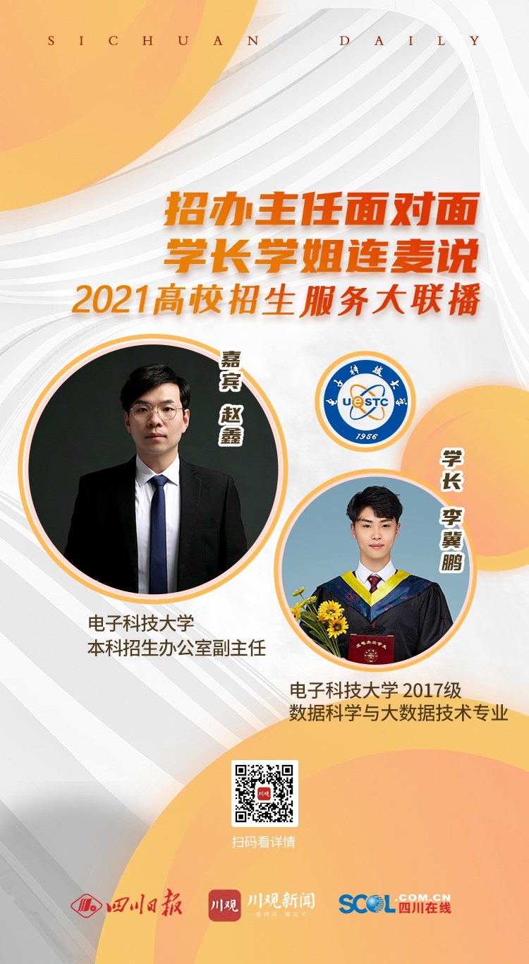 6月24日,由川观新闻推出的“招办主任面对面 学长学姐连麦说”2021高校招生服务大联播第二场开启。电子科技大学本科招生办公室副主任赵鑫做客大联播,为考生带来电子科技大学今年最新的招生信息。