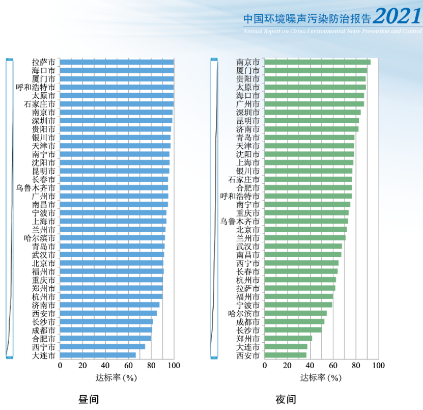 哪个城市最安静?哪个城市最“吵”?近日,生态环境部官方网站发布《2021中国环境噪声污染防治报告》,报告显示,在2020年全国31个直辖市、省会城市和5个计划单列市中,大连市成昼间最“吵”城市,其昼间总点次达标率为66.7%。值得关注的是,成都市在夜晚较为“吵闹”——夜间总点次达标率仅为52.6%,在“榜单”中排名倒数第5。