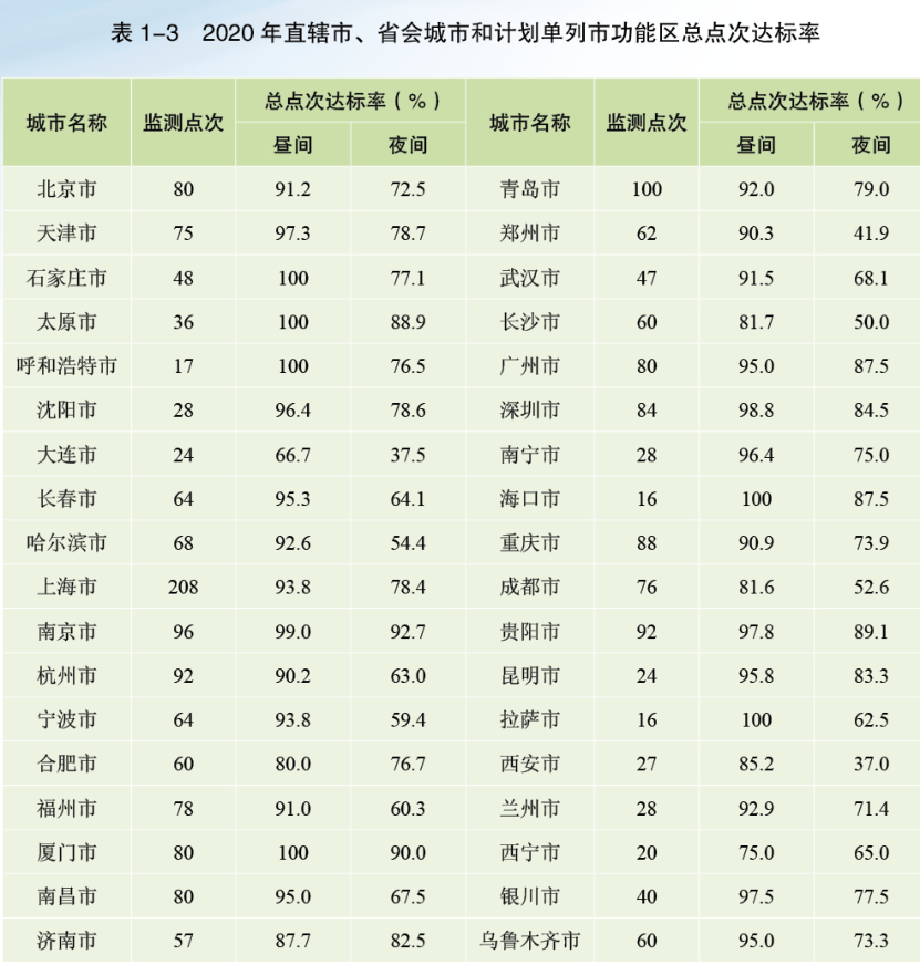 报告显示,2020年,31个直辖市、省会城市和5个计划单列市各类功能区共监测4406点次,昼间达标率为92.8%,夜间达标率为72.6%。与上年相比,昼间和夜间达标率分别提升4.4个和12.6个百分点。总体来看,2020年直辖市、省会城市和计划单列市功能区昼间点次达标率高于夜间。