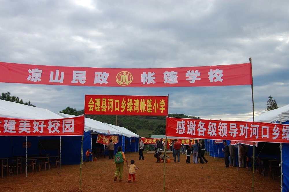 “8.30”会理地震发生后,凉山州民政局第一时间在会理县河口乡搭建了第一所帐篷学校。