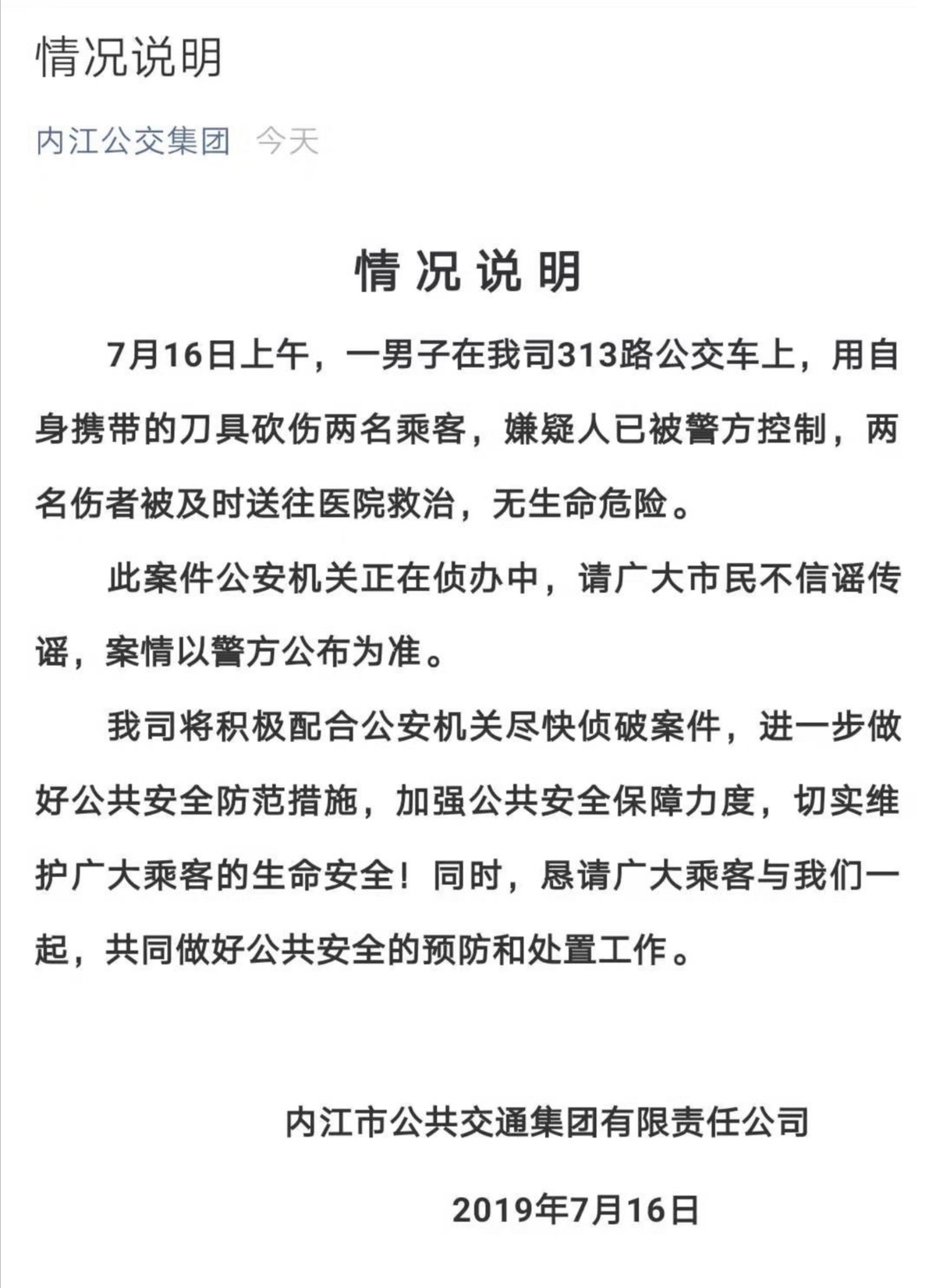 今天上午,内江一男子在该市313路公交车上,用自身携带的刀具砍伤了一同乘车两名市民。