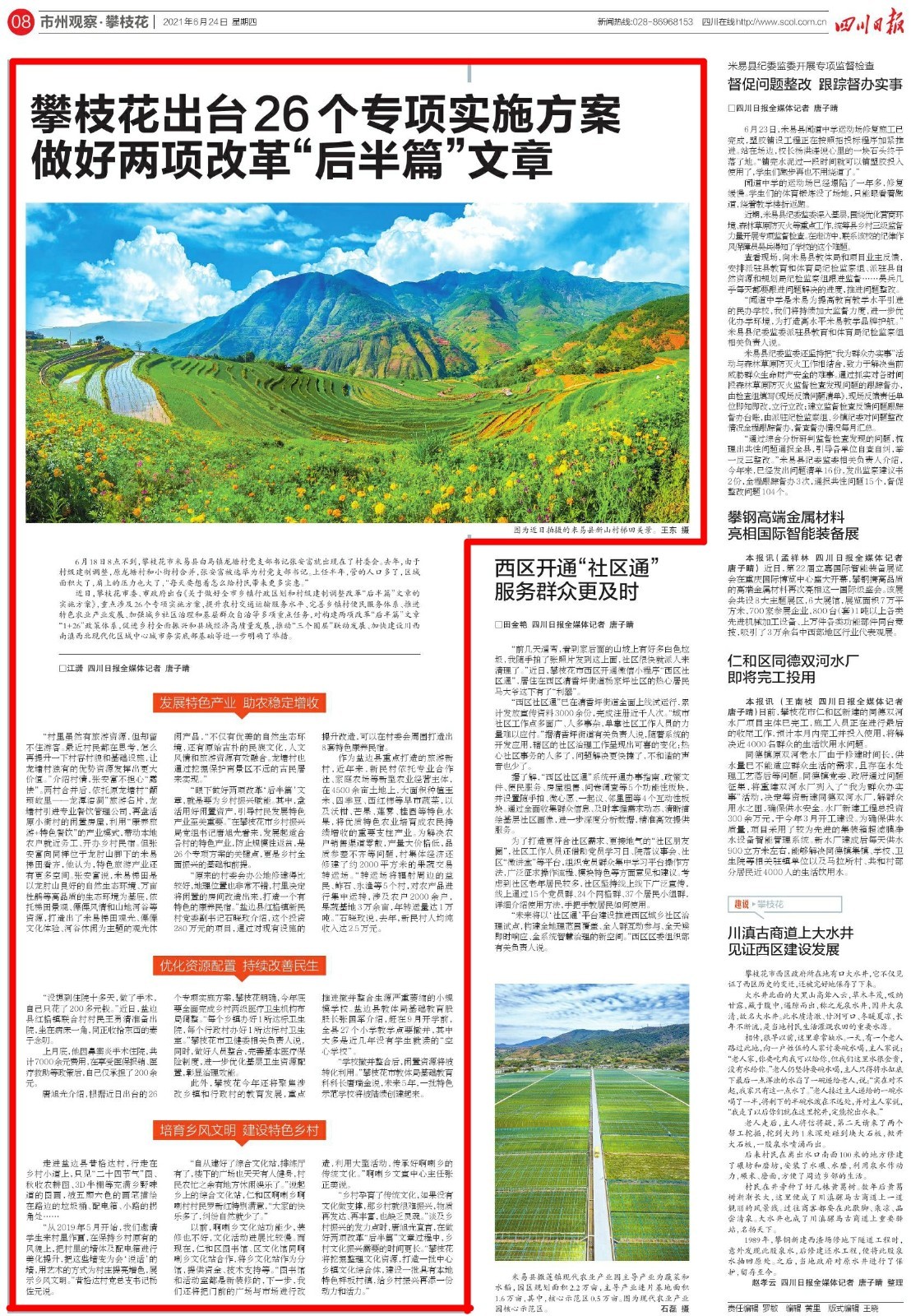 近日,攀枝花市委、市政府出台《关于做好全市乡镇行政区划和村级建制调整改革“后半篇”文章的实施方案》,重点涉及26个专项实施方案,提升农村交通运输服务水平、完善乡镇村便民服务体系、推进特色农业产业发展、加强城乡社区治理和基层群众自治等多项重点任务,对构建两项改革“后半篇”文章“1+26”政策体系,促进乡村全面振兴和县域经济高质量发展,推动“三个圈层”联动发展、加快建设川西南滇西北现代化区域中心城市夯实底部基础等进一步明确了举措。