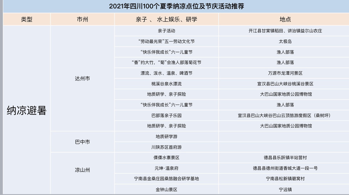6月24日,“清凉天府 安逸四川”2021夏季文化旅游系列产品新闻通气会在成都召开。会上,省旅游宣传促进中心与四川省营地与自驾游协会共同推出《四川夏季纳凉点分布图》并“打包”了避暑目的地、特色美食、特色民宿、休闲度假、文化体验等100个暑期纳凉避暑好去处。