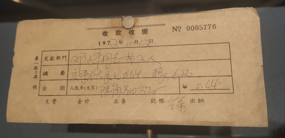 1972年底,中央安排邓小平到江西各地参观。这是他和夫人在清江县参观时,到饭店吃便餐时付钱和粮票后,服务员开的收据,显示餐费是六角四分现金以及六两粮票。