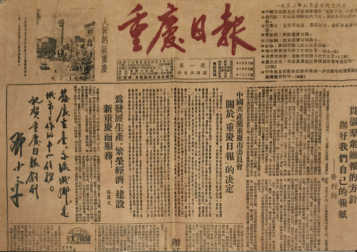 1952年8月5日《重庆日报》正式创刊,时任中共中央西南局第一书记的邓小平亲自为《重庆日报》题词“发展生产,交流城乡,是城市工作的中心任务。祝贺重庆日报创刊。”