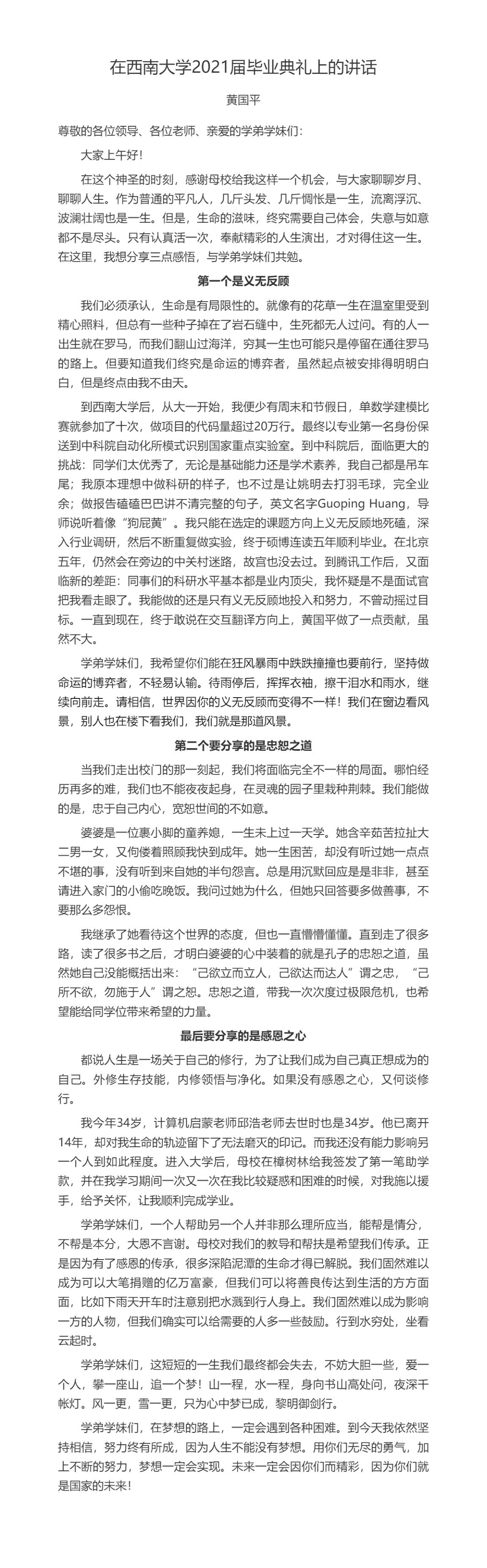 这一次,他作为西南大学本科生毕业典礼校友代表回到母校,作了题为《认真活一次》的分享,跟学弟学妹们回顾了自己在西南大学的求学经历,他说“从大一开始,我便少有周末和节假日,数学建模比赛就参加了十次,做项目的代码量超过20万行。最终以专业第一名保送到中科院自动化所模式识别国家重点实验室。”