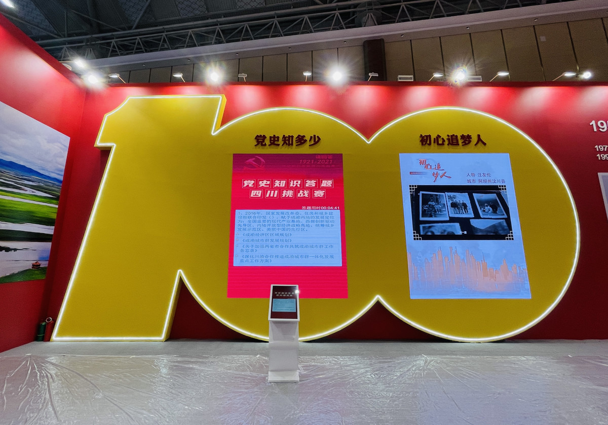6月底,“壮丽史诗 伟大飞跃”——四川省庆祝中国共产党成立100周年主题展览即将在成都世纪城会展中心开启大幕。在展览尾厅,一个巨大的黄色阿拉伯数字“100”吸引了记者的目光。走近细看,主办方巧妙利用“100”的形象特征,在两个“0”内嵌入LED显示屏,做成“党史知多少”“初心追梦人”两大互动体验专题。