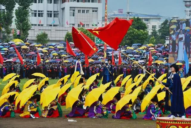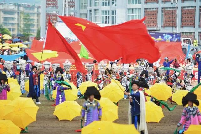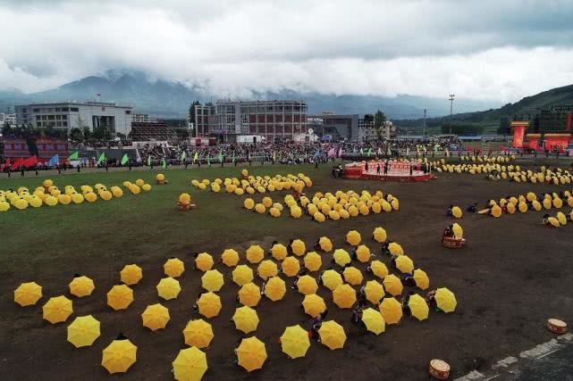 一片黄伞中,高高挥扬着几面鲜艳的五星红旗,黄伞下是各具特色的彝族服饰和装扮,这一切无不彰显着布拖是一片充满血色风采和韧性精神的土地,是一片具有开拓进取和只争朝夕勇气的土地,是一片拥有博大胸襟和海纳百川精神的土地。