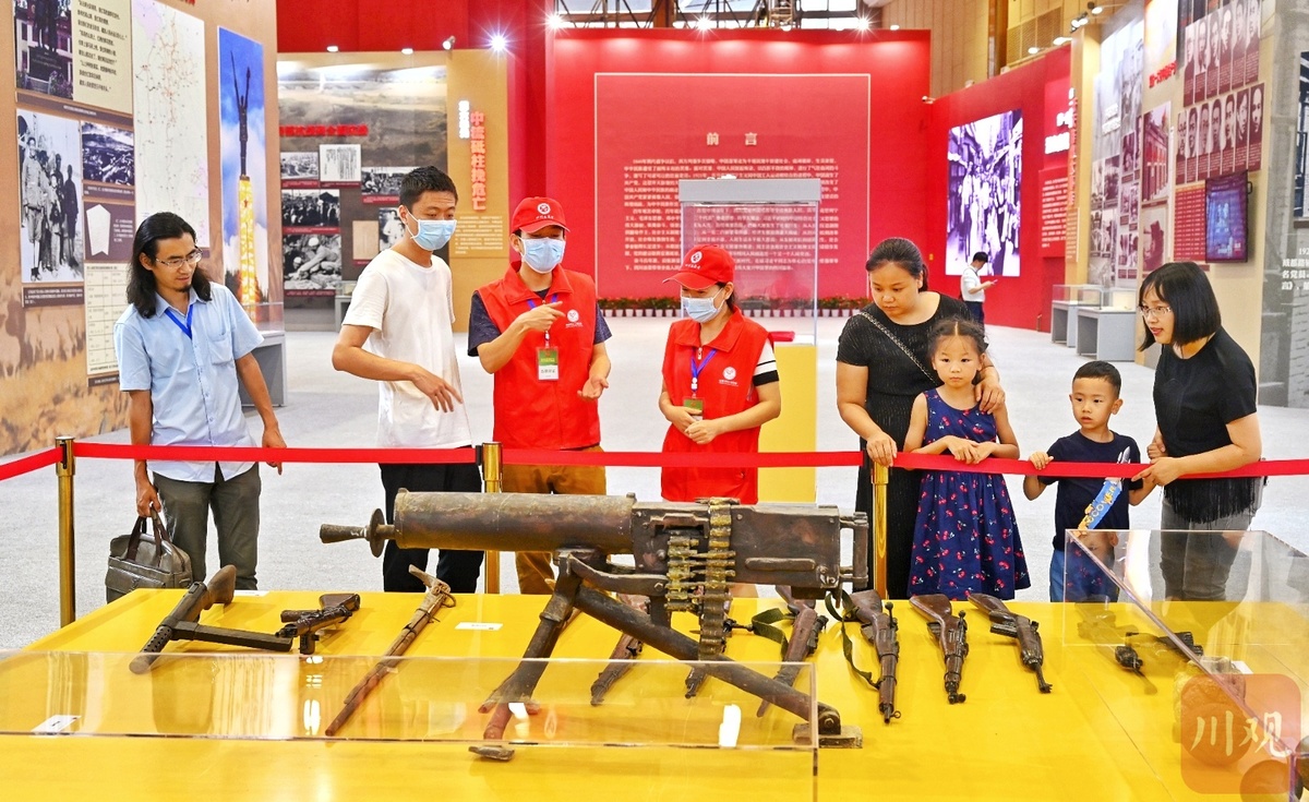 抗美援朝版块,英雄黄继光的一组文物吸引着不少观众驻足。朝鲜民主主义共和国授予他的金星奖章、朝鲜国旗勋章,四川省人民政府献给黄继光烈士家属的锦旗,甚至来自上甘岭黄继光炸碉堡时飞片炸毁的“英雄岩”等文物,无不诉说着那段可歌可泣的历史。在抗美援朝中,四川有30789名志愿军牺牲,数量为全国之最。
