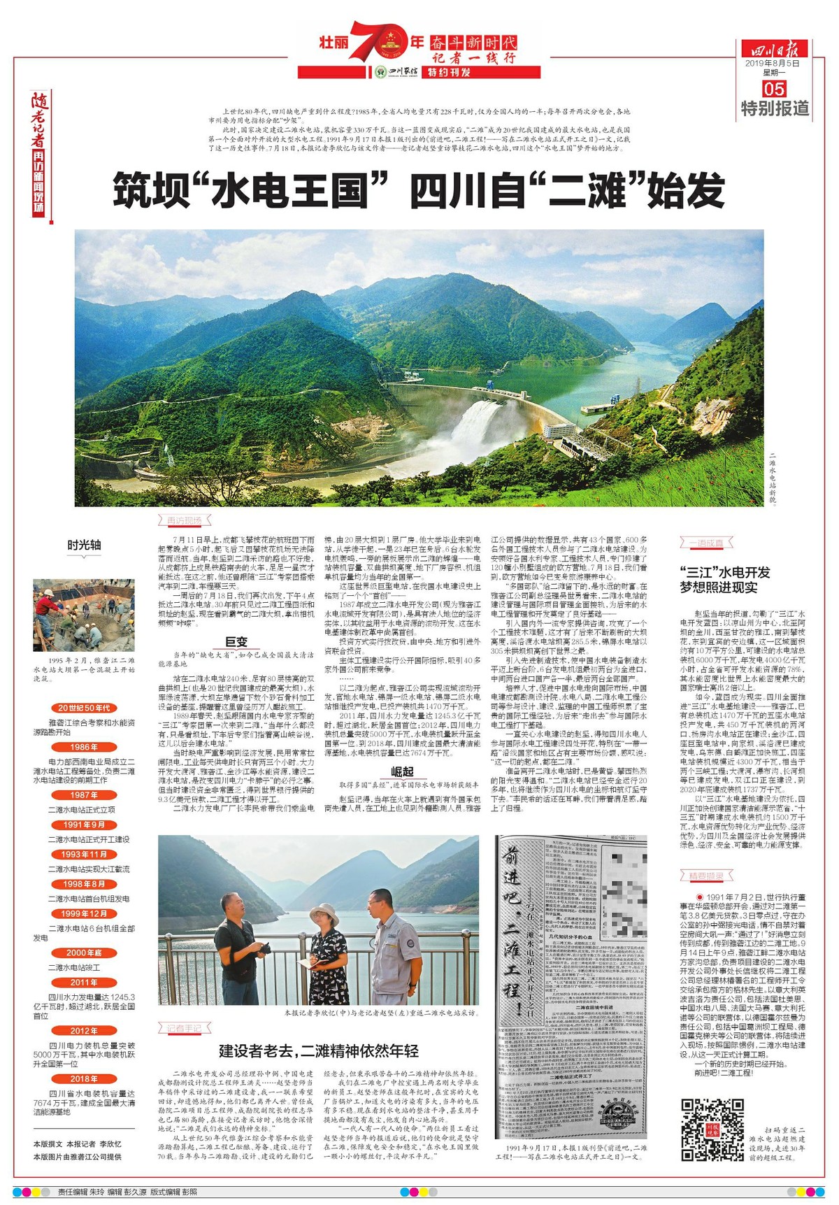 1991年9月17日,《四川日报》1版刊登《前进吧,二滩工程!——写在二滩水电站正式开工之日》一文,吹响二滩水电站建设的号角。7月18日,本报记者李欣忆与该文作者——老记者赵坚重访攀枝花二滩水电站,重回四川水电工程奇迹的开启之地。