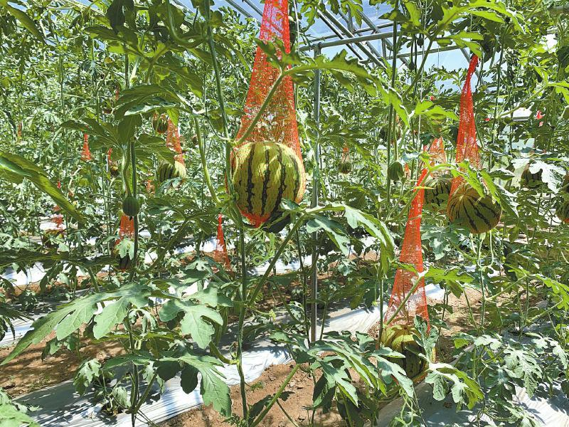旭日乡现代农业示范基地的西瓜大棚里果实累累。
