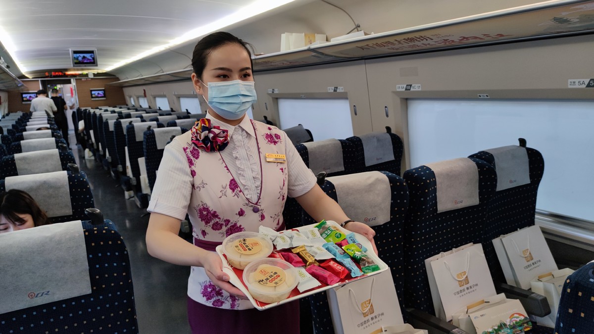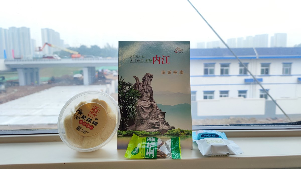 在座位桌板、行李架等处,以“活力之城甜蜜内江”为主题的海报同样营造了浓浓的“内江味道”。乘客收到了以内江元素为主题设计的手提包,包中则是内江特产。包括无花果冻干片、黄老五花生酥、汉安糖草精品红糖、隆昌豆丝糖等甜食,让游客能品尝甜城知名特产。“之前听说过内江有‘甜城’称号,没想到今天在车上就能体验到内江甜食。”来自泸州的乘客陈女士表示,期待实地到内江体验这座城市的甜蜜文化。