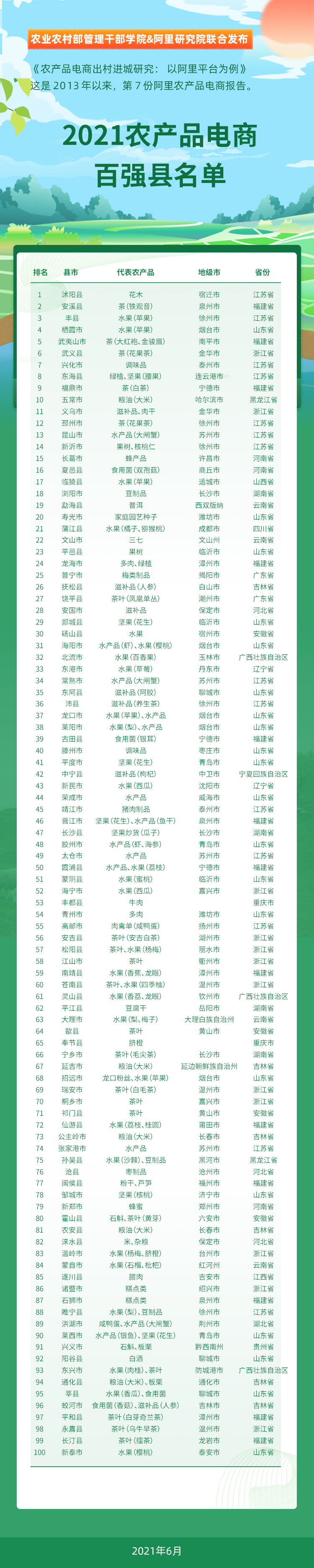 报告同时发布了农产品电商“百强县”名单。其中,宿迁沭阳县(花木)、泉州安溪县(铁观音)、徐州丰县(苹果)、烟台栖霞市(苹果)、南平武夷山市(大红袍、金骏眉)、金华武义县(花果茶)、泰州兴化市(调味品)、连云港东海县(绿植、腰果)、宁德福鼎市(白茶)、哈尔滨五常市(大米)位居全国前十。