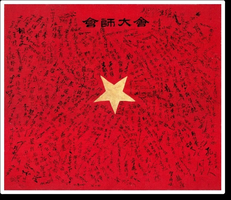 12月27日,成都解放,红旗挂满大街小巷,30多万名群众夹道欢迎解放军。贺龙、王维舟、李井泉等200多人在一面红旗上签下名字。