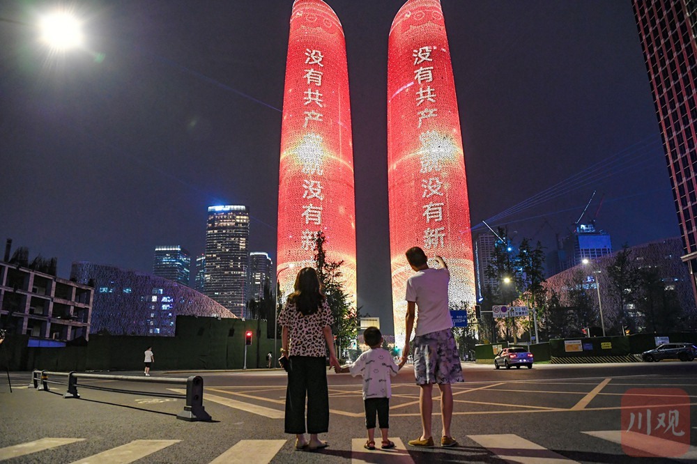 成都金融城双子塔主题灯光秀庆祝建党百年。李强摄