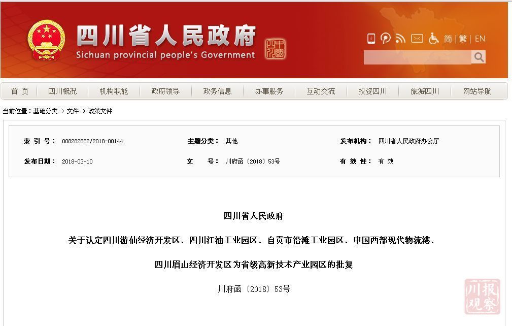 2018年3月10日,四川省人民政府发布批复,正式同意中国西部现代物流港为省级高新技术产业园区,名称为遂宁高新技术产业园区。