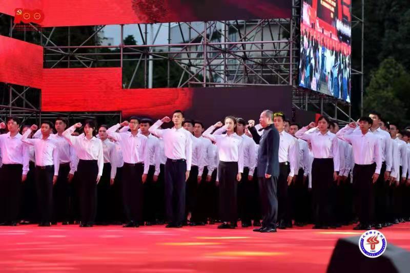 文艺晚会以《红船启航》拉开序幕,一艘红船,承载着建党救国的梦想,成都体育学院近300名大学生新党员在领誓人学校党委书记刘青带领下,面向党旗庄严宣誓,展现出承继百年理想、坚定信仰、矢志追求的新生力量。新民主主义革命时期,红船领航28载,四川省体育专科学校在烽火硝烟中创立,担当起了强体救国的时代使命。社会主义革命和建设时期,中国共产党团结带领人民完成改天换地的兴国大业,成体人同奋起,共发展,坚守“刚毅坚卓、发愤图强”的精神基因,谱写了一曲曲艰苦奋斗的时代赞歌。改革开放新时期,党解放思想、实事求是,完成了富国大业,改革创新精神也融进成体人的血脉基因,形成“以体为本、体医渗透、体文结合、体艺融合”的办学特色。在敢于追梦、走向复兴的新时代,成体人秉承“行健不息,积健为雄”的校训,正奋力开启建设世界一流体育大学新征程。晚会在全场激情合唱《没有共产党就没有新中国》的嘹亮歌声中落下帷幕。全校师生手持党旗,放声歌唱,深情表达对党的真挚祝福和热爱。