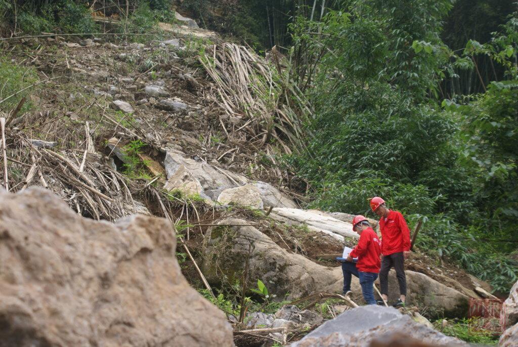 6月18日天一亮,专业地勘单位的技术人员立马行动起来,先从群众上报的点位开始查起。202队工程师张川带领两位技术人员来到了石格闹崩塌现场勘查。他抬头望去,山坡像被撕了一条口子,大小石块滚落到路面上。