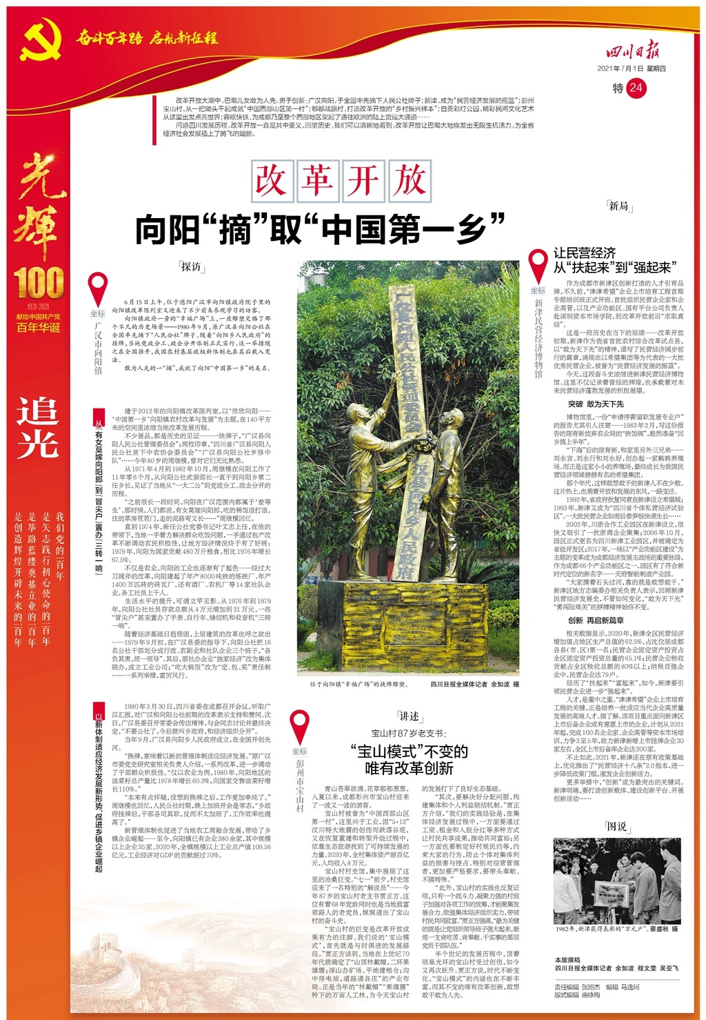 改革开放大潮中,巴蜀儿女敢为人先、勇于创新:广汉向阳,于全国率先摘下人民公社牌子;新津,成为“民营经济发展的摇篮”;彭州宝山村,从一把锄头干起成就“中国西部山区第一村”;郫都战旗村,打造改革开放的“乡村振兴样本”;自贡彩灯公园,精彩民间文化艺术从这里出发点亮世界;蓉欧快铁,为成都乃至整个西部地区架起了通往欧洲的陆上货运大通道……