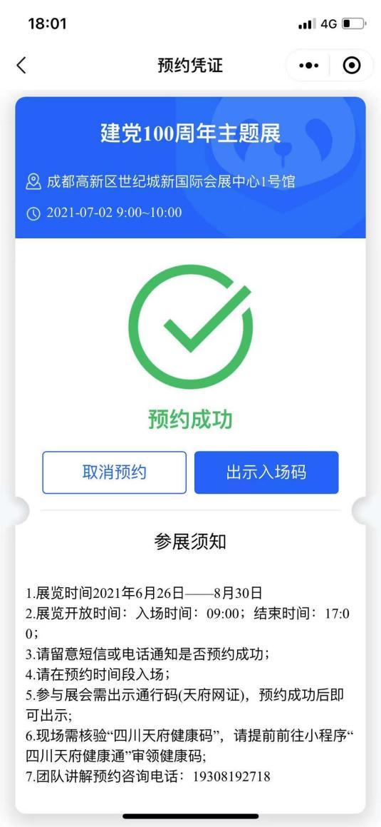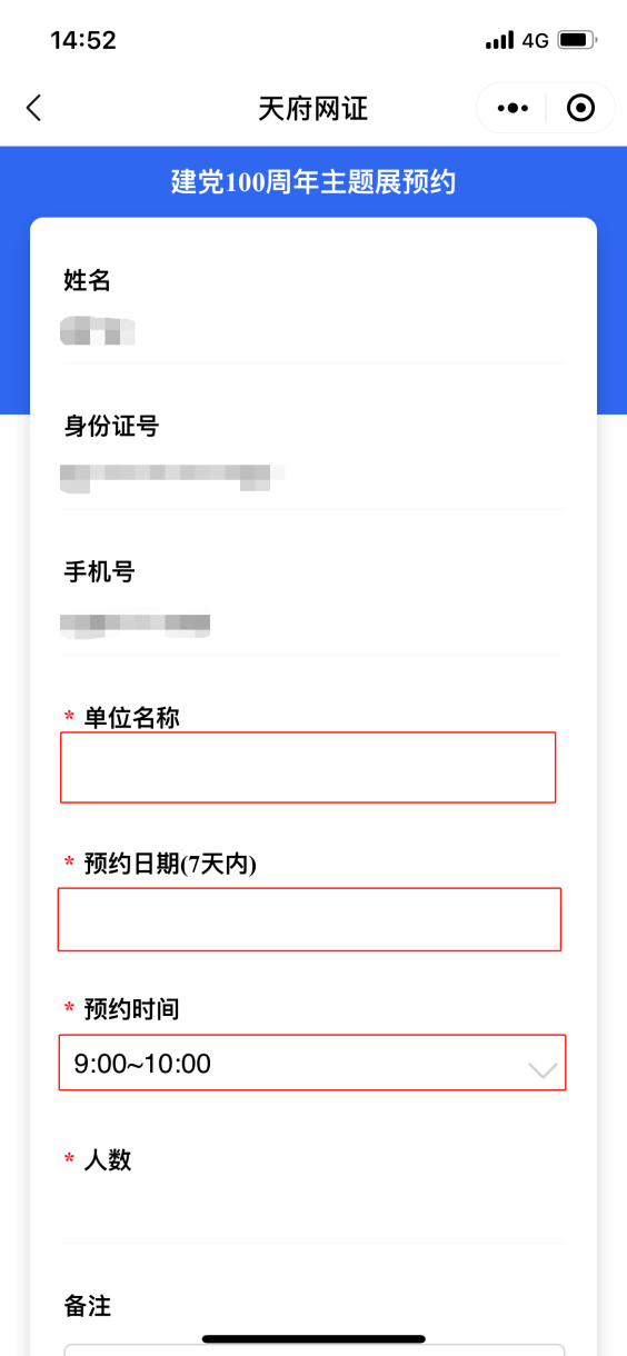 扫码二维码,注册了“天府网证”的观展者,在手机上填报单位名称、参观人数、参观时间,以及预约人基本信息等,即可预约,最多可提前7天,每天有6个时间段可供选择。