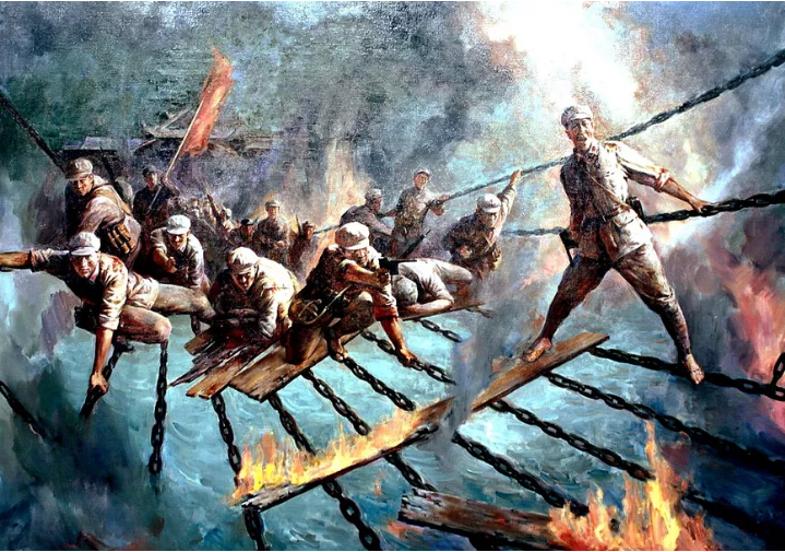 这群年轻人沿着枪林弹雨和火墙密布的铁索,踩着铁链夺下桥头,并与东岸部队合围占领泸定桥。