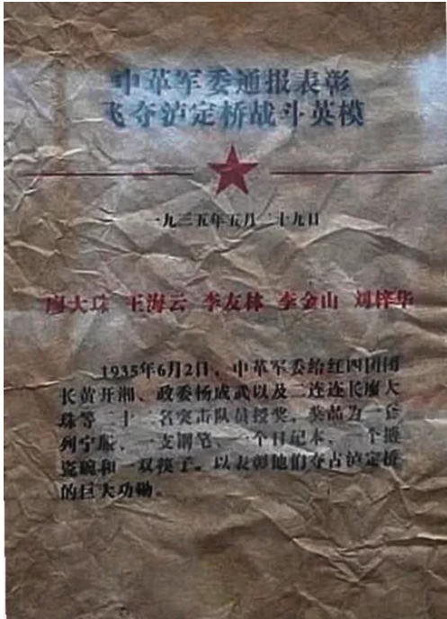 1935年签发的飞夺泸定桥战斗英模表彰(图为后期艺术制作品,现挂于红军飞夺泸定桥纪念馆)