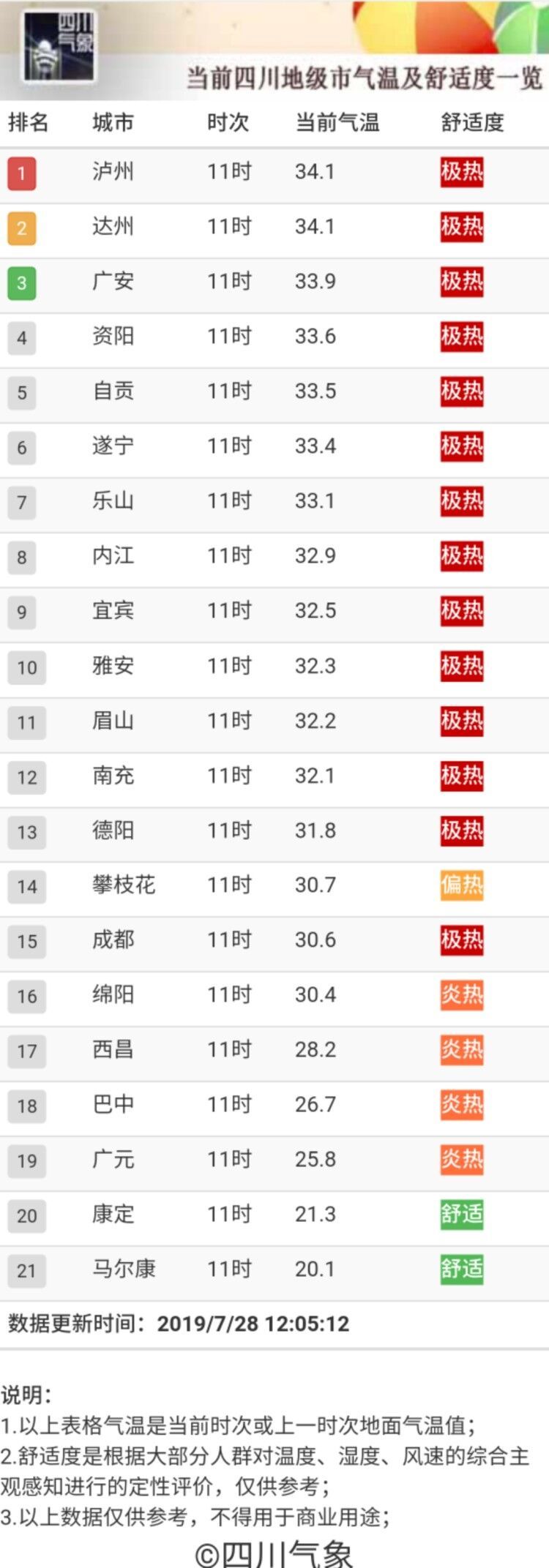 截至中午12时,这些地区已发布了高温橙色预警信号,预计当地今天白天最高气温将达到35℃以上(宜宾地区达到38℃以上):