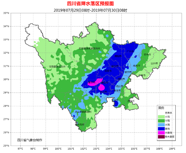 30日白天到晚上:盆地大部地方阴天有雷雨或阵雨,雨量普遍中雨,局部地方有大到暴雨;川西高原和攀西地区阴天间多云有阵雨或雷雨,其中甘孜州南部、攀西地区大部有中雨,局部大雨到暴雨。