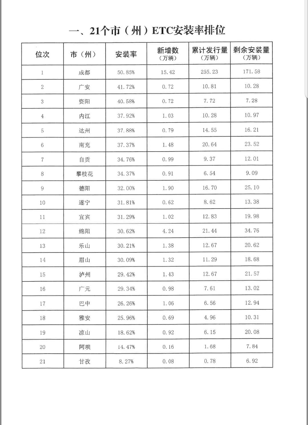 今年6月,我省印发了《关于深化收费公路制度改革取消高速公路省界收费站的通知》,明确提出在2019年底前,我省要新增524万ETC用户,在籍汽车ETC安装率要达到80%以上。其中,成都市安装率要达到85%以上,通行高速公路的车辆ETC使用率要达到90%以上。