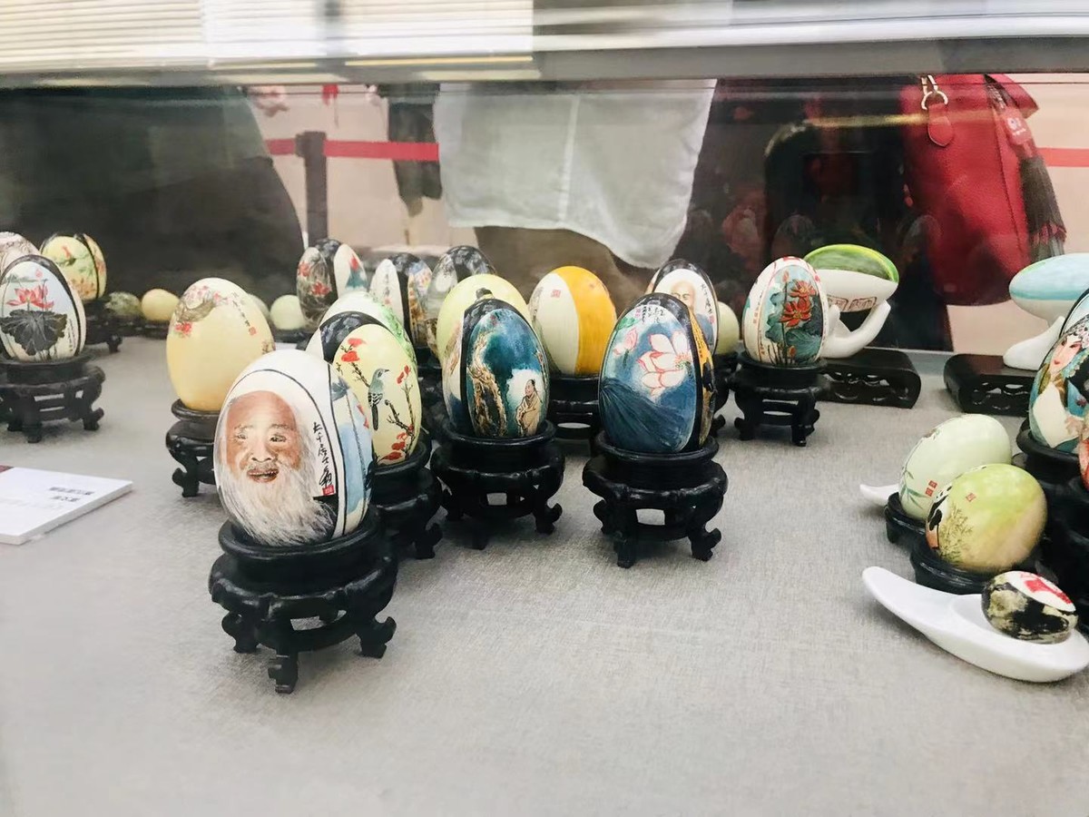 在美术馆一楼,展出的是200余件民间文艺作品,有《红船》《神舟庆党》等烙画作品,有《百年辉煌》《红色记忆》等剪纸作品,也有《内江风貌系列》《祖国颂系列》等雷氏蛋壳画,共有木雕、影雕、扇雕、奇石等13个门类。这些作品不仅展现了内江民间文艺工作者的高超技艺和工匠精神,更表达了他们爱党爱国的赤子之心。
