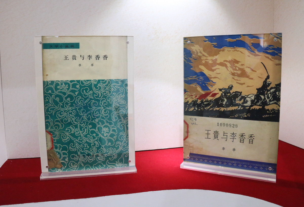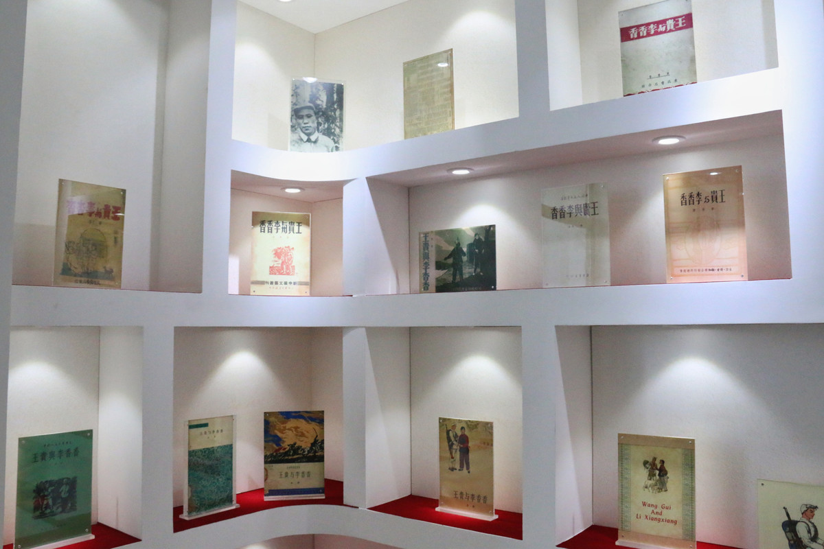 展览的核心区域特别整理展出两部长篇叙事诗《王贵与李香香》《漳河水》的封面版本序列,时间跨度长达七十余年。两部诗集分别由李季和阮章竞创作,以民歌形式讲述劳动人民走上革命道路的故事,分别于1946年、1949年首次刊出,此后多次再版。据四川大学“刘福春中国新诗文献馆”馆长刘福春介绍,“延安文艺座谈会后,中国革命文艺运动进入新阶段,两部诗集在此时应运而生,彰显‘二为’思想的同时,也见证着文艺工作者同劳动人民的深度结合,在中国新诗史和出版史上具有重要意义,表现出独特的研究和展藏价值。”