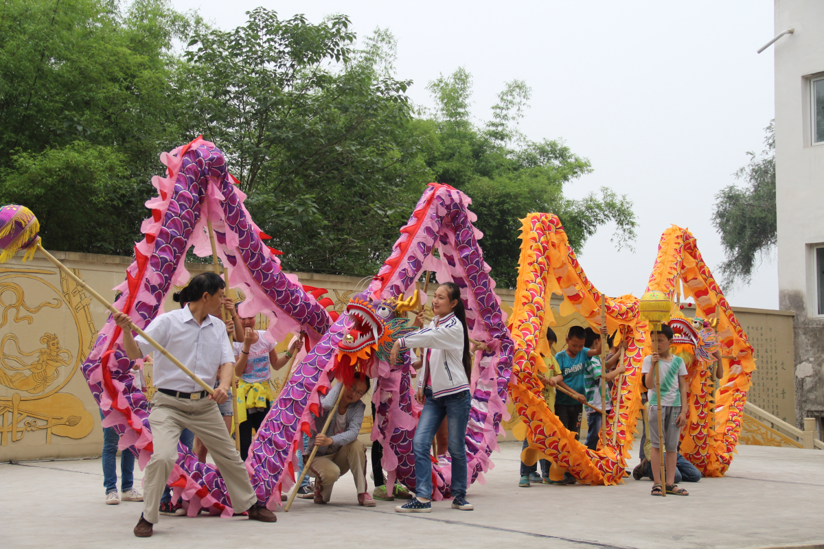李培元(左一)培训艾叶镇少年龙灯队。受访者供图