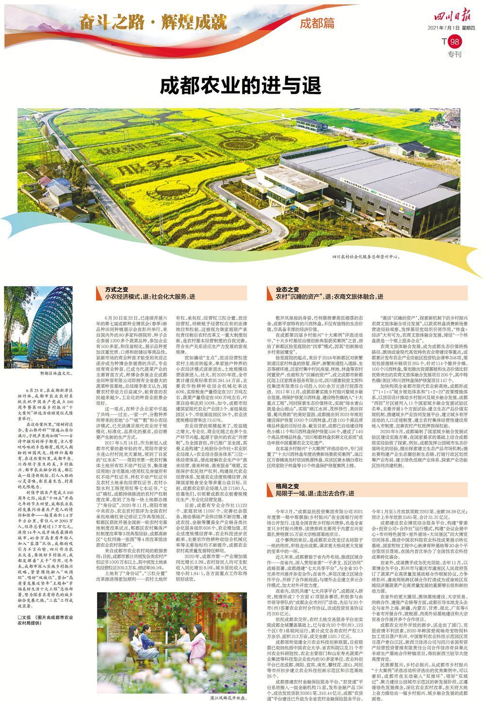 时值中国共产党成立100周年之际,站在“十四五”开局之年的节点回望,成都农业农村发展闪动着共产党人的情怀和使命——辐员面积1.4万平方公里,常住人口2093万人,经济总量超过1.7万亿元,连续14年入选幸福感最强的城市,40余万高素质年轻人加入“蓉漂”队伍,成都的吸引力不言而喻。四川作为农业大省,要做好乡村振兴,成都发挥着“主干”作用。近年来,成都市深入实施乡村振兴战略,紧紧围绕融入“双循环”、唱好“双城记”,紧扣“高质量发展攻坚年”主题和“幸福美好生活十大工程”总体部署,努力探索具有特色的城乡融合发展之路,“三农”工作成效显著。