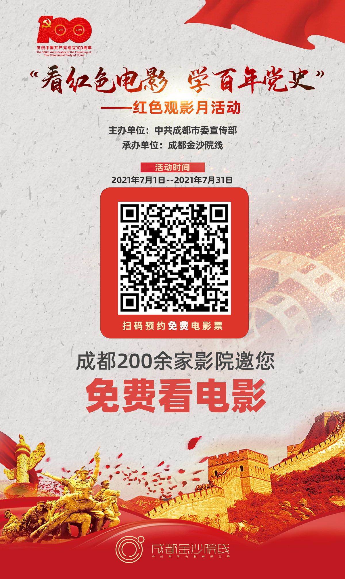本次活动承办方成都金沙院线相关负责人介绍,此次“看红色电影 学百年党史”红色观影月活动将覆盖成都各个区(市)县影院,广大群众可通过扫码预约免费观影。
