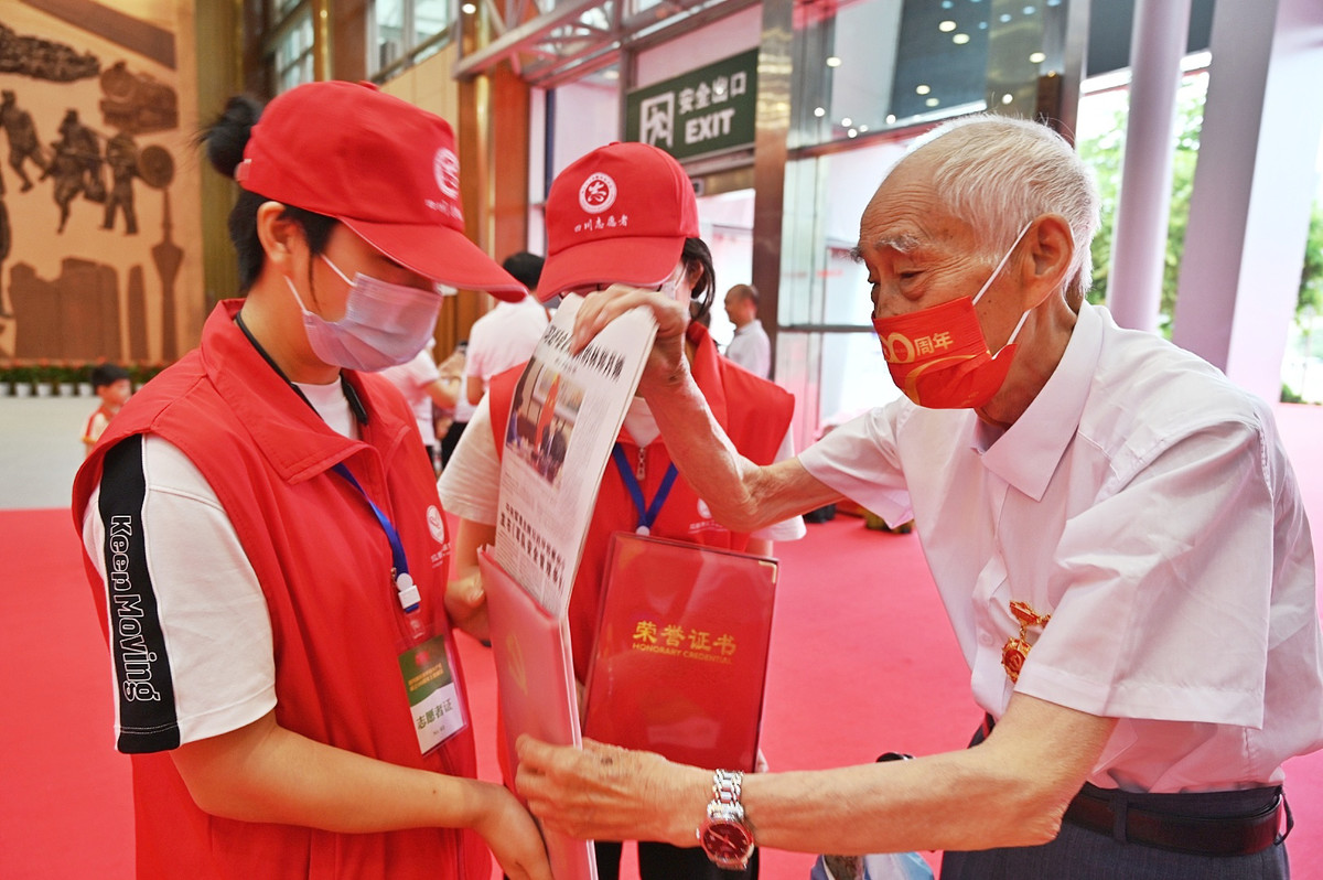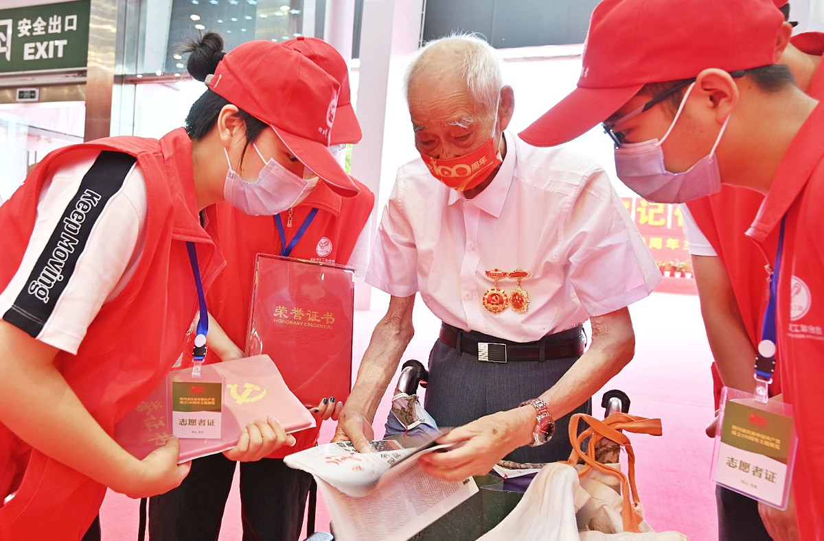 大会刚结束,刘曰荣就特意戴上了“光荣在党50年”纪念章和“庆祝中华人民共和国成立70周年”纪念章,在家人陪同下来到了“壮丽史诗 伟大飞跃”——四川省庆祝中国共产党成立100周年主题展现场。
