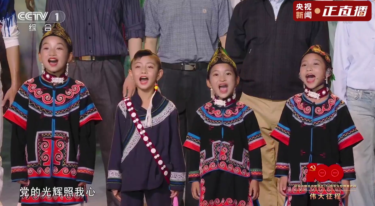 8名小朋友共参演了3个节目,其中一个是讲述脱贫攻坚故事的戏剧与歌舞《东方奇迹》。当悬崖村的背景出现在舞台的大屏幕上时,“唱支山歌给党听,我把党来比母亲……”吉合拉作小朋友以甜美声音的领唱《唱支山歌给党听》,随后8个凉山小朋友齐唱,与参演人员唱共同深情演绎起这首歌曲。