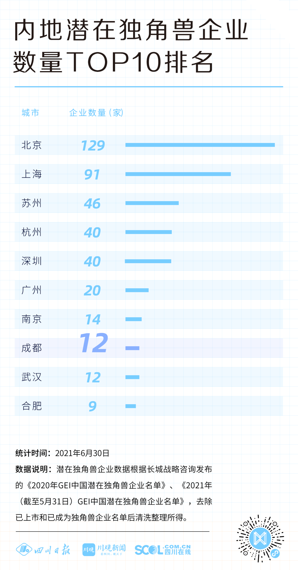 内地潜在独角兽企业数量排在前十位的城市分别是北京、上海、苏州、杭州、深圳、广州、南京、成都、武汉、合肥,其中北京以129家潜在独角兽企业排在榜首,成都排在第八位。