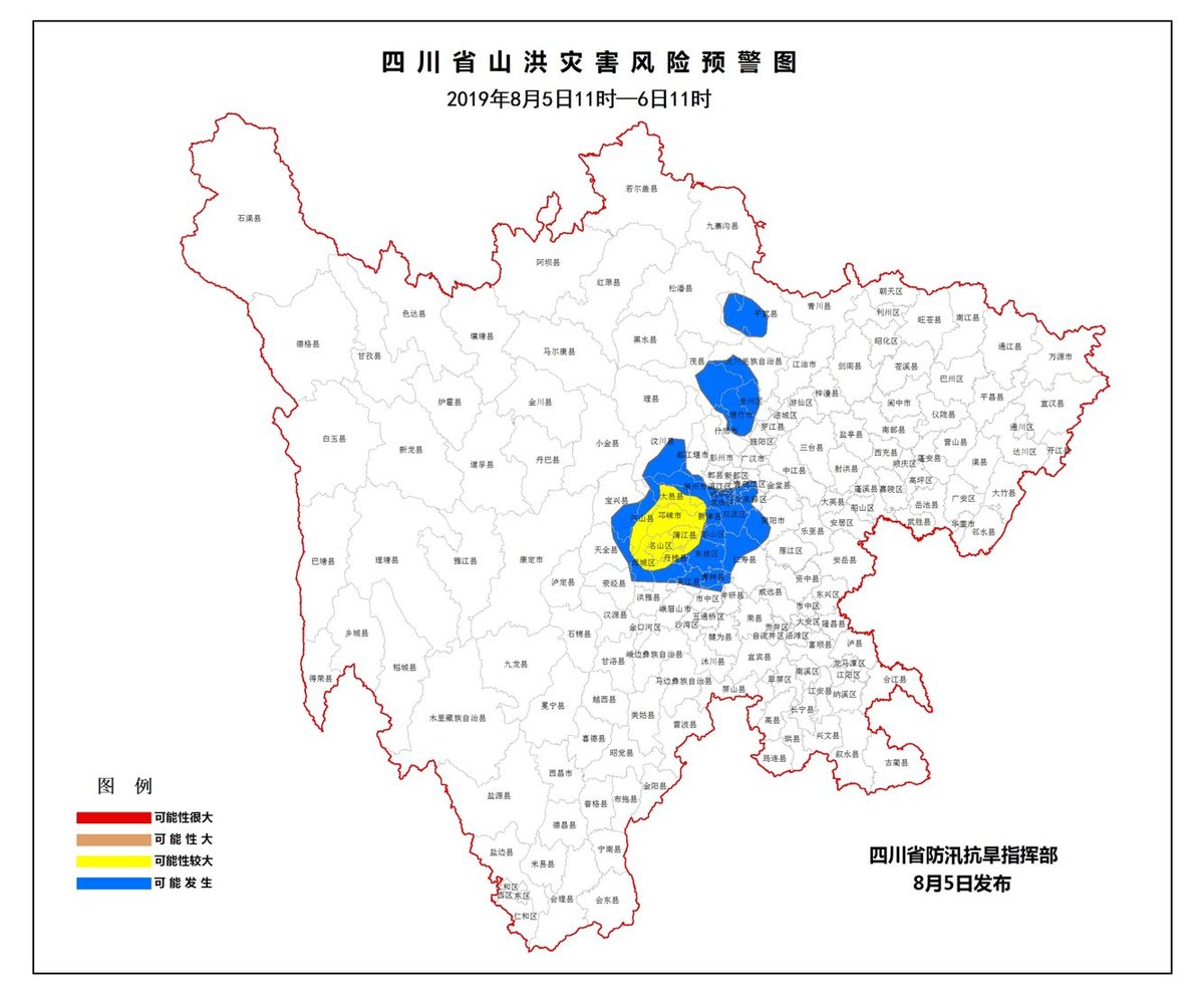 根据预测,8月5日11时至6日11时,雅安市名山区、芦山县、雨城区,眉山市丹棱县、东坡区、洪雅县,成都市大邑县、邛崃市、蒲江县等9县(市、区)发生山洪灾害可能性较大;绵阳市平武县、北川县、安州区,德阳市绵竹市、什邡市,阿坝州松潘县、茂县、汶川县,成都市都江堰市、崇州市、双流区、龙泉驿区、简阳市、新津县,眉山市彭山区、仁寿县、青神县,乐山市夹江县、井研县、乐山市中区,雅安市宝兴县、天全县等县(市、区)可能发生山洪灾害。