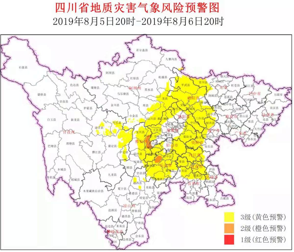8月5日,省自然资源厅发布全省地质灾害气象风险预警。结合四川省气象台天气预报情况,8月5日20时~8月6日20时,全省地质灾害气象风险预警结果如下: