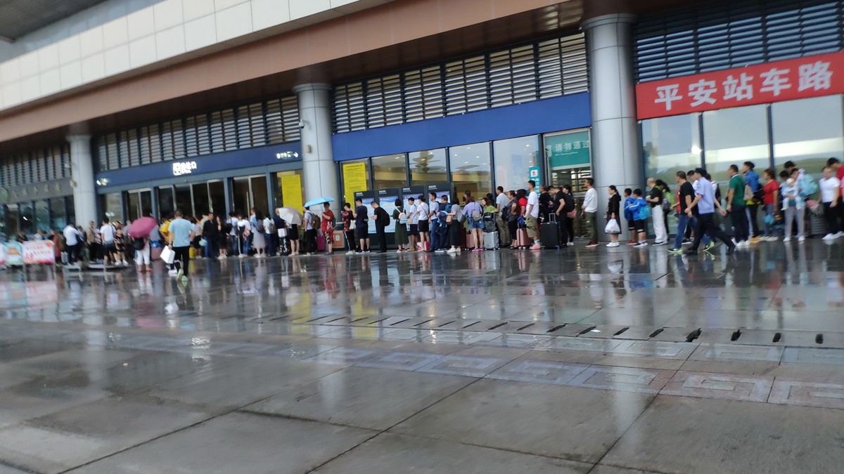 眉山东站的迟迟不开门纳客,导致近百位旅客在站外排成了一条长龙,在雨中等待进站。