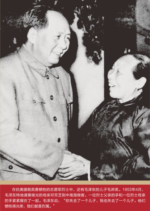 文物上方的墙上,有一张毛泽东主席在中南海接见黄继光母亲邓芳芝的照片。照片中,毛主席和邓芳芝的手紧紧握在一起。黄继光纪念馆馆长涂琳告诉记者,这张照片拍摄于1953年4月,当时邓芳芝作为妇女代表,出席了中国妇女第二次全国代表大会,得知这个消息后,特意邀请邓芳芝到中南海做客。在会见邓芳芝时,毛主席说:“你失去了一个儿子,我也失去了一个儿子。他们牺牲得光荣,我们都是烈属。”这次会面,不仅仅是人民领袖在向一位英雄母亲表达敬意,也因为他们都是烈士遗属,都有儿子在朝鲜战场上牺牲,都经历着同样的悲伤,也拥有着同样的荣光。