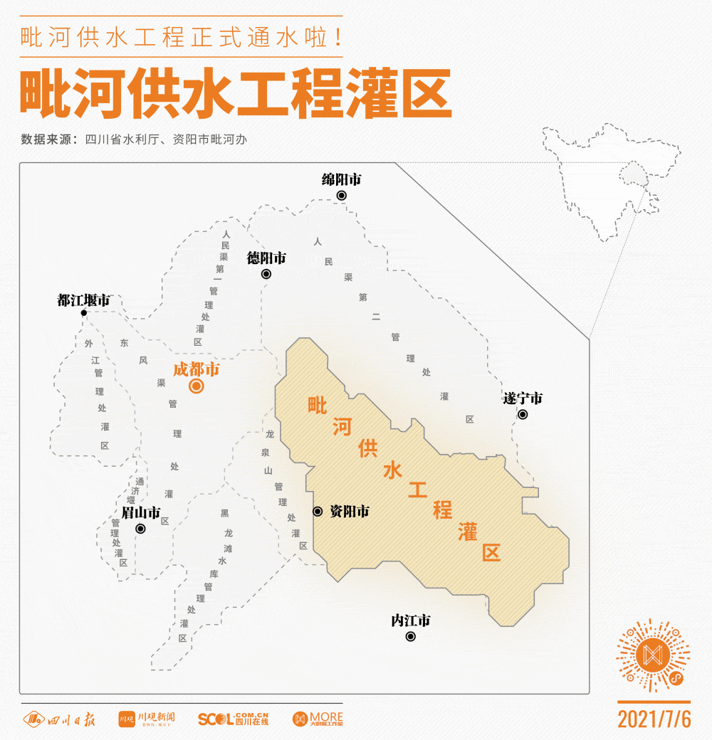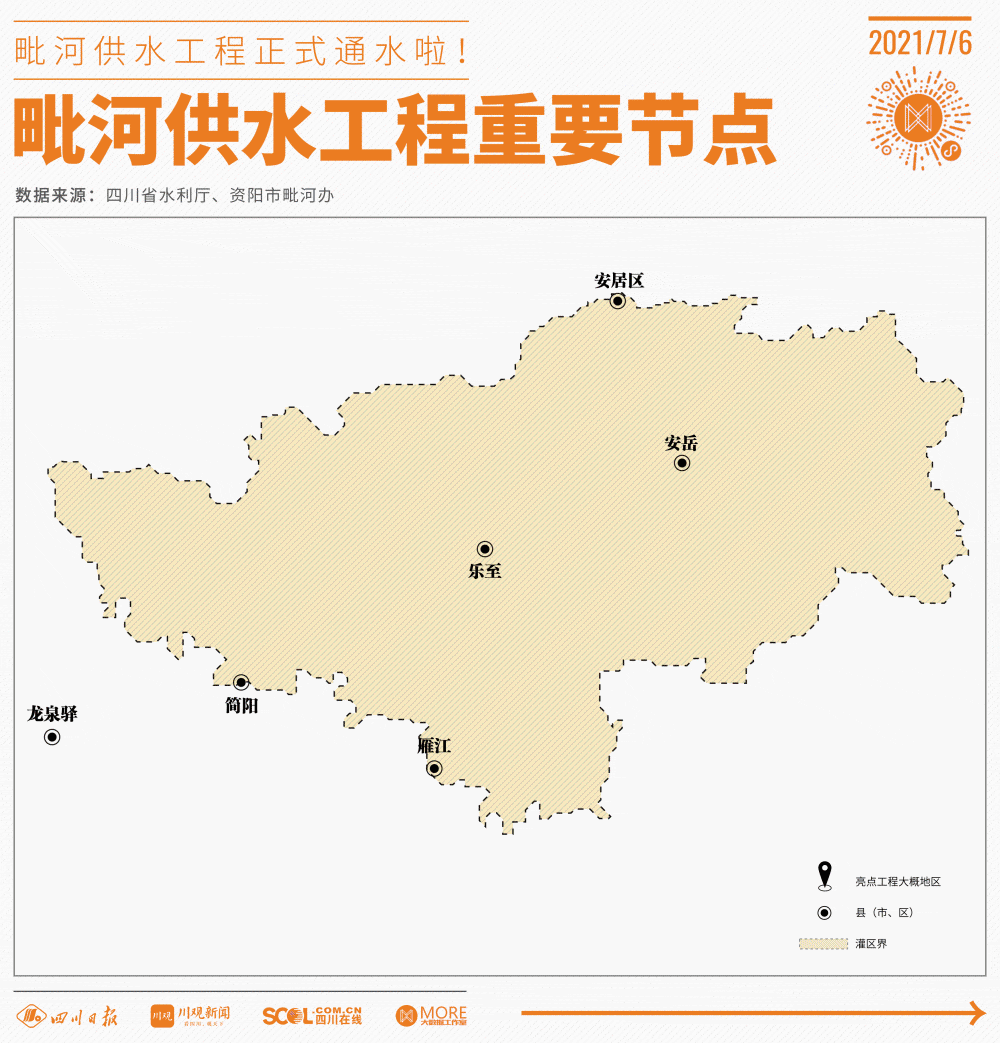 毗河供水工程是我省“再造都江堰”水利大提升重点骨干项目,涉及成都、资阳、遂宁3市的新都、青白江、金堂、简阳、雁江、安岳、乐至、安居、大英9个县(市、区),面积7147平方公里,设计灌溉面积417万亩,供水人口489万人。供水区域内水资源人均拥有量是全国人均量的五分之一、全省人均量的六分之一,属重度缺水地区。
