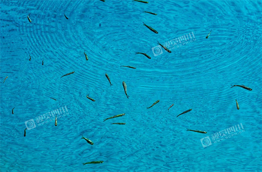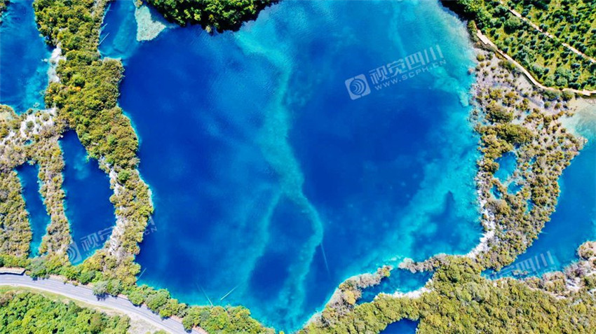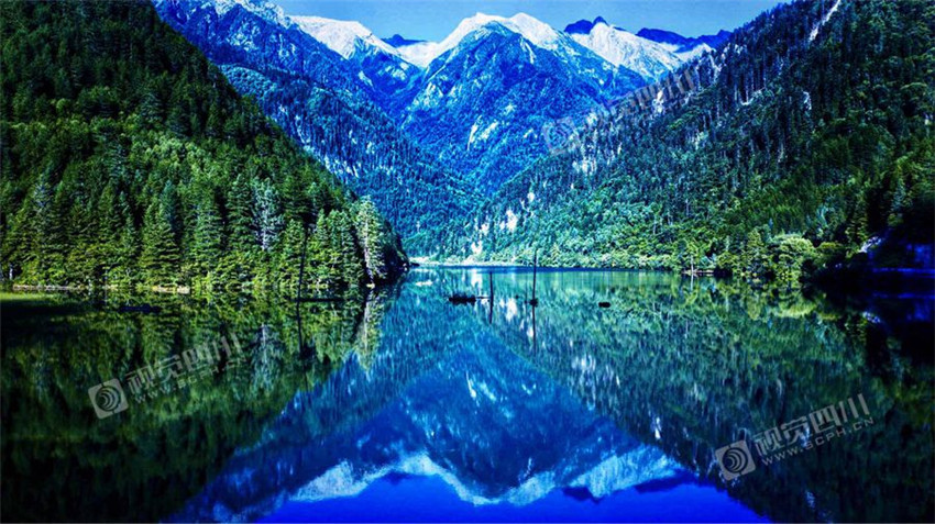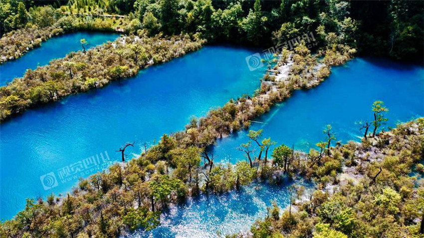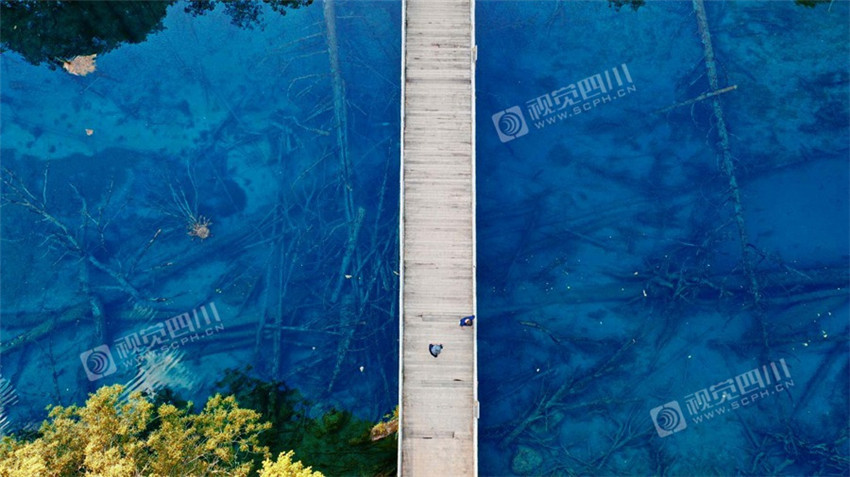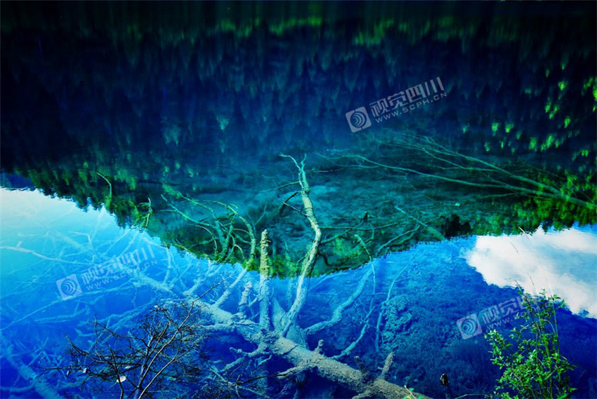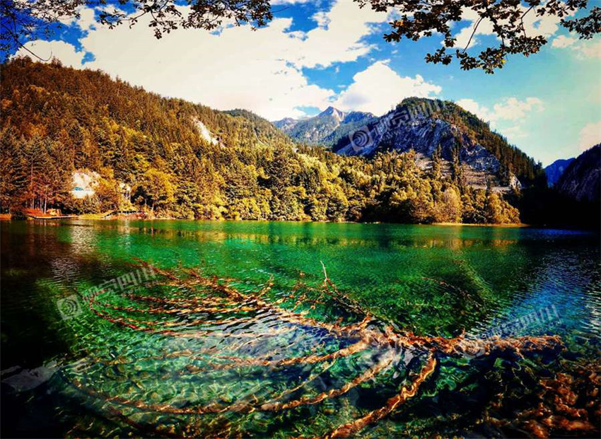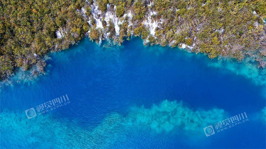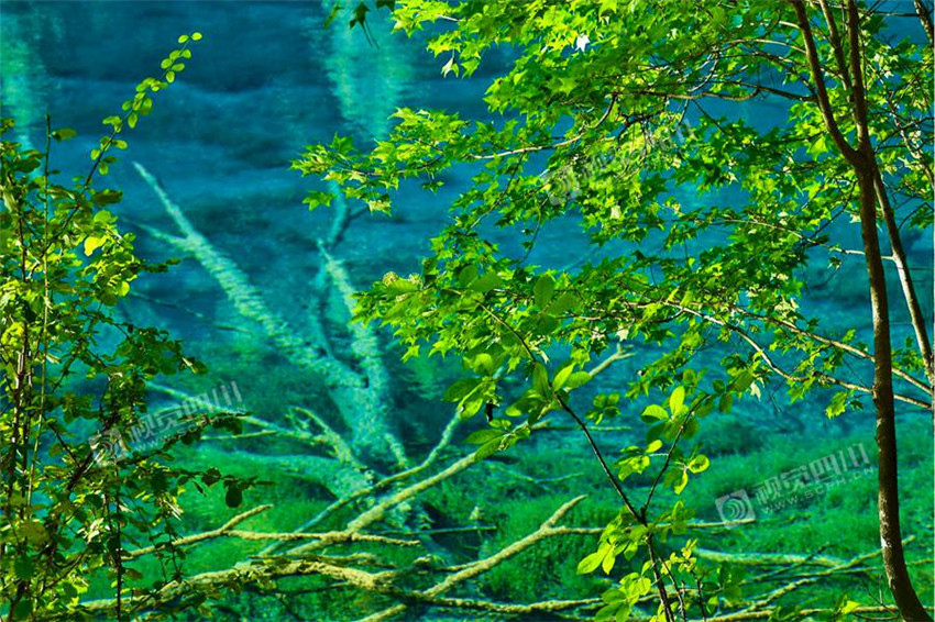 向景区深处走,记者一行来到宁静澄明的五花海。在同一水域中,鹅黄、墨绿、深蓝、藏青各种色彩缤纷交错,绚丽多姿。岸上茂密的树林倒映池中,与水下的沉木相互映衬,既静谧又绚烂。