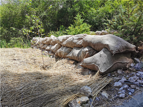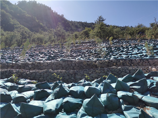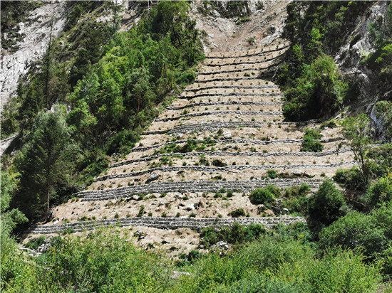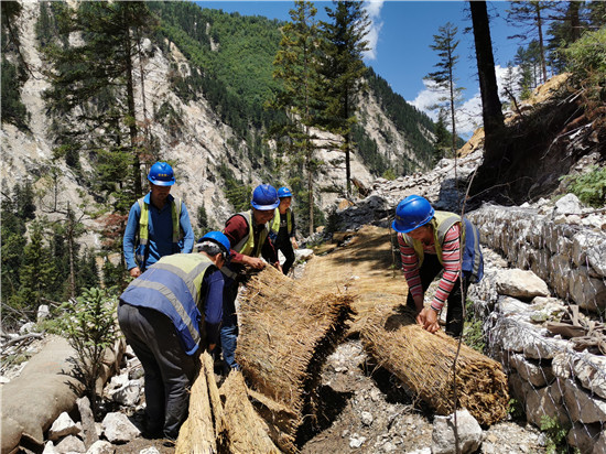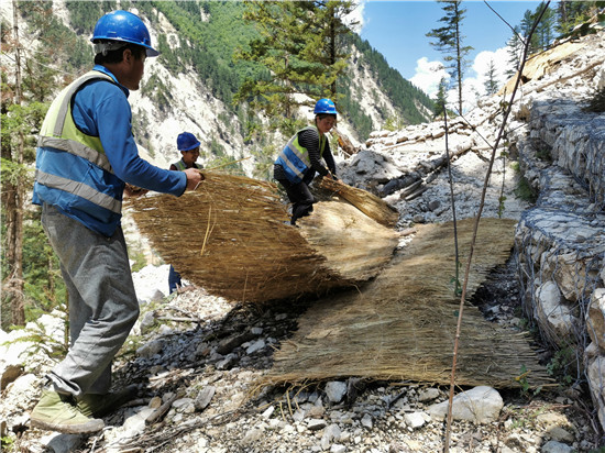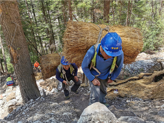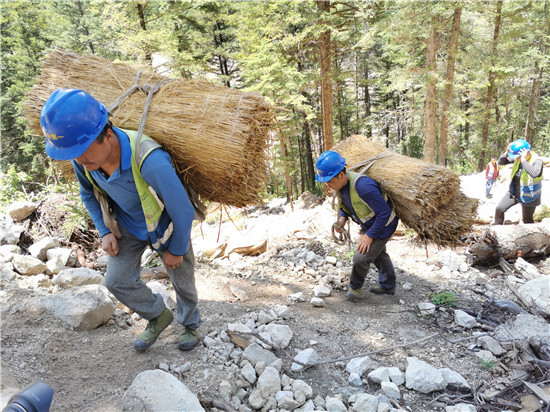 震损林的清理和植被恢复,是九寨沟灾后重建生态环境修复保护的先导工作。“治理分了四个步骤来实施。”项目现场负责人告诉记者,先是人工一点点清理震损林倒掉的树木和危石,再是用铅丝笼装石块砌成挡墙、用土石袋装泥土码成阶梯,每隔3米左右,就做一层。然后运来有肥力的土壤和耐旱易活的本地树种、草籽,进行栽种撒播。最后就是浇水灌溉和铺草垫,提高林草植被存活率。