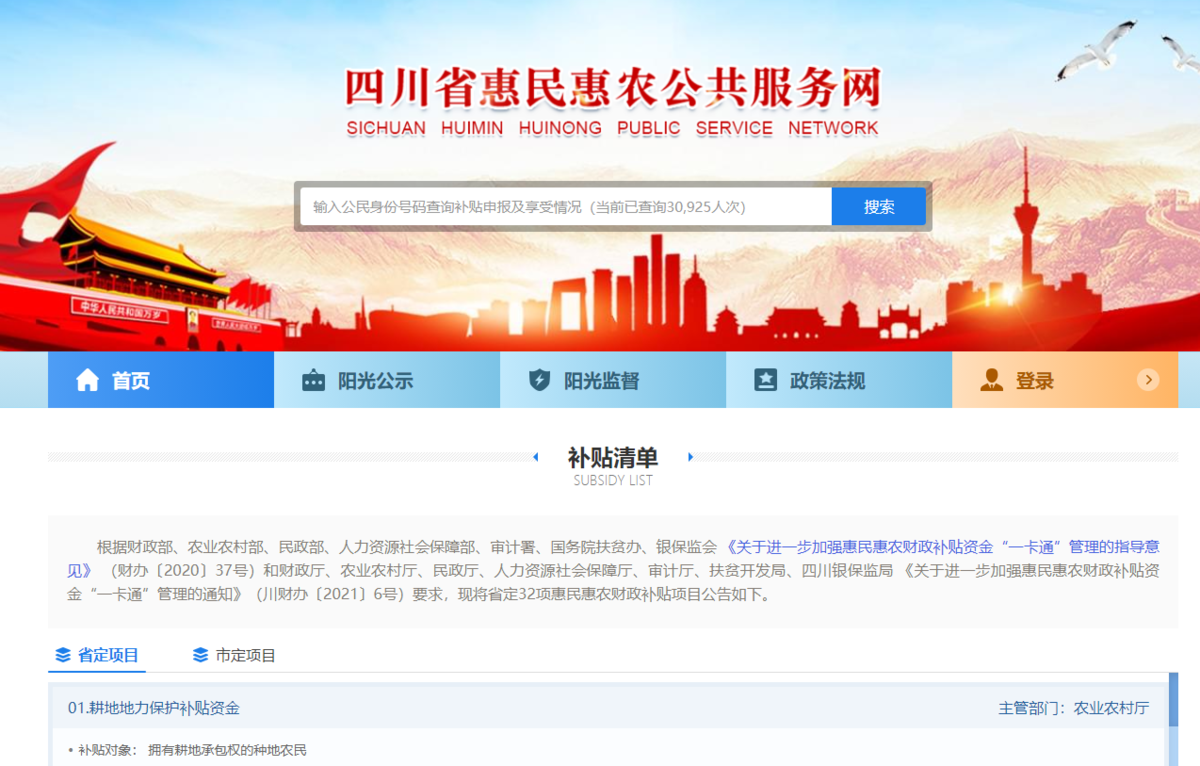 同时,除涉及个人隐私的外,该网站还可通过录入个人身份证号码信息,查询补贴申报及享受情况。以此逐步实现四川惠民惠农财政补贴资金“阳光审批、阳光发放、阳光监管”。