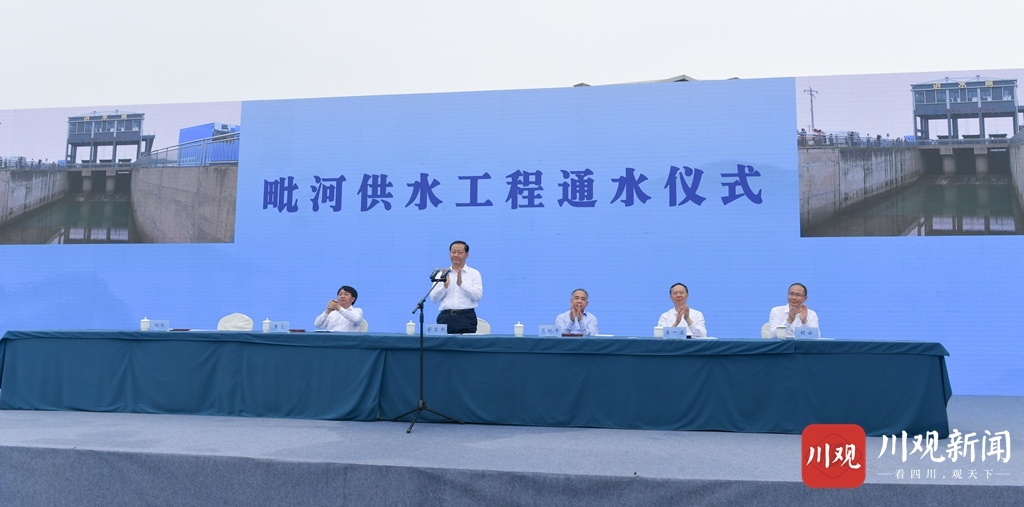 10时许,毗河供水工程通水仪式以“主会场+分会场”形式举行。仪式上,水利厅负责同志汇报毗河供水工程有关情况,成都市、遂宁市、资阳市负责同志通过视频连线方式分别汇报所在地工程完成及试水情况。省委常委、常务副省长罗文讲话,代表省委、省政府对工程顺利建成通水表示祝贺,要求各地各有关方面围绕生产、生活、生态用水需要,聚焦保证农业和乡村振兴用水、保障城镇和产业用水、保护生态和人居环境用水,科学规划配置水资源,打造形成四川水网体系,建立健全水利工程建设和管理长效机制,形成支持水利事业发展的强大合力,奋力推动新时代水利事业高质量发展。